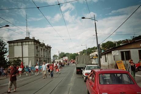 ein Festumzug, aber viel wichtiger: das rote Auto ist ein "Zastrava Scala 55", neben dem "Yugos Tempo 1.1" das meistgesehene Auto